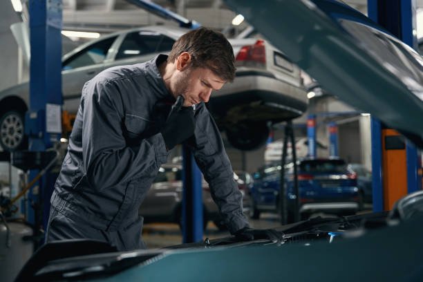 Man in protective clothes standing in tire fitting near car with open hood and checking car air conditioner